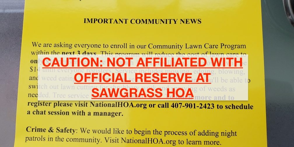 We have been notified of yellow flyer shown below being placed on doors in the Reserve at Sawgrass community from “National HOA.” Please be advised this is a private company soliciting lawn care services. They are not in any way affiliated with the official Reserve at Sawgrass Homeowners Association, nor are they an actual HOA. They also operate as “BW Property Management”.