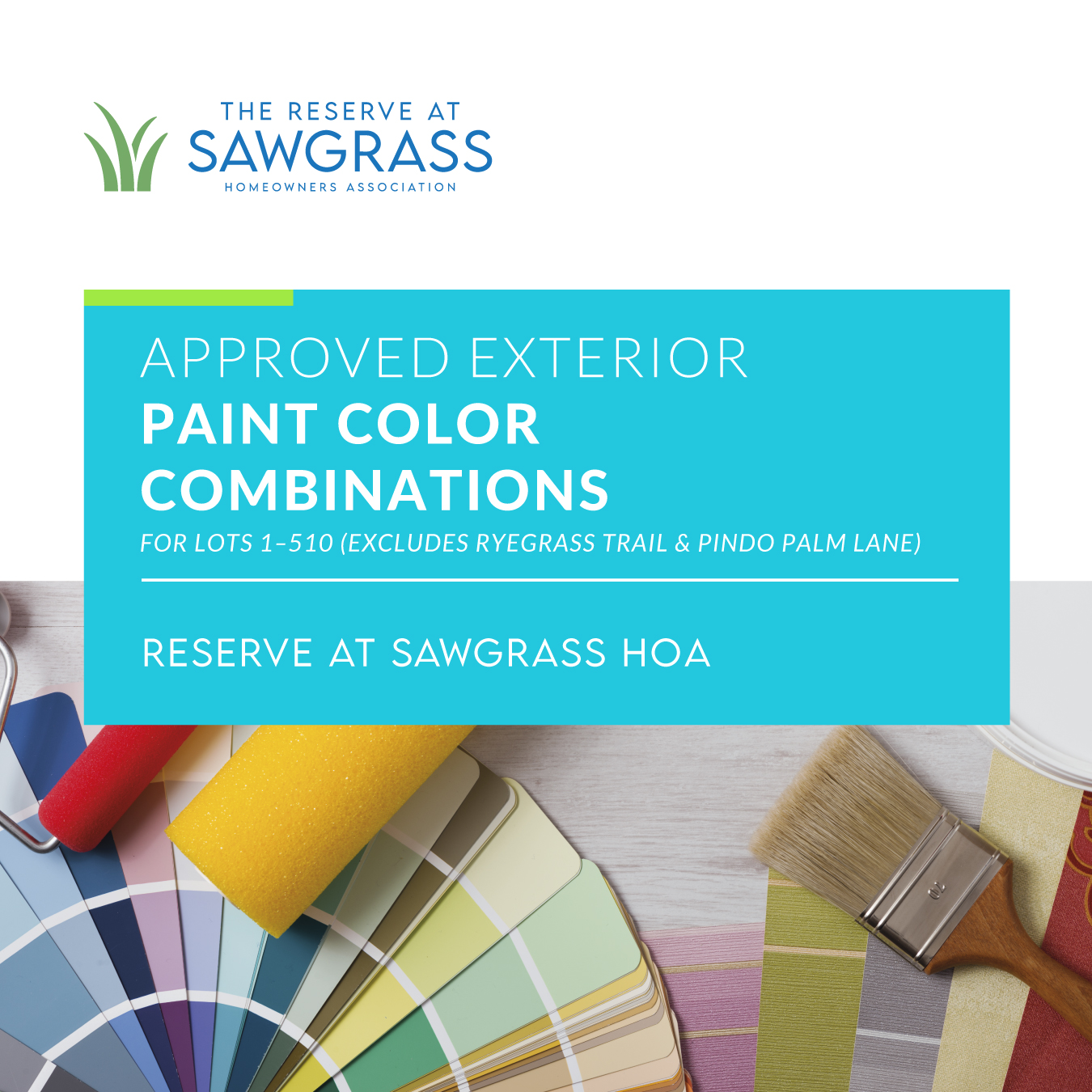 Approved color combinations for homes in the original Reserve at Sawgrass phases. These do not apply to home in the Extension property on Ryegrass Trail or Pindo Palm Lane.