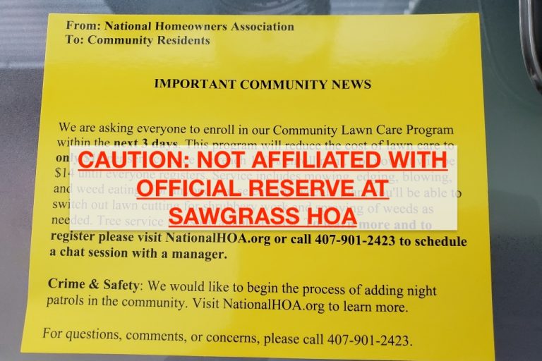 Dear Reserve at Sawgrass Resident, We have been notified of yellow flyer shown below being placed on doors in the Reserve at Sawgrass community from “National HOA.” Please be advised this is a private company soliciting lawn care services. They are not in any way affiliated with the official Reserve at Sawgrass Homeowners Association, nor are…